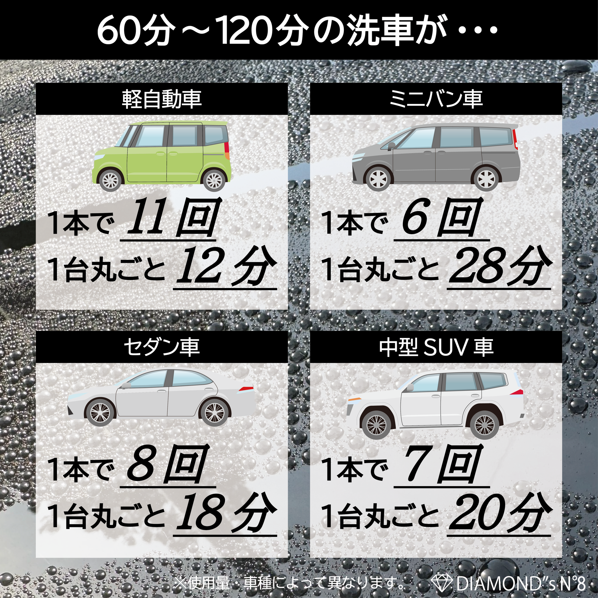 セダンタイプなら1本で7回洗車が可能!しかも1台18分で洗車と撥水までできるから、コストパフォーマンスも抜群!